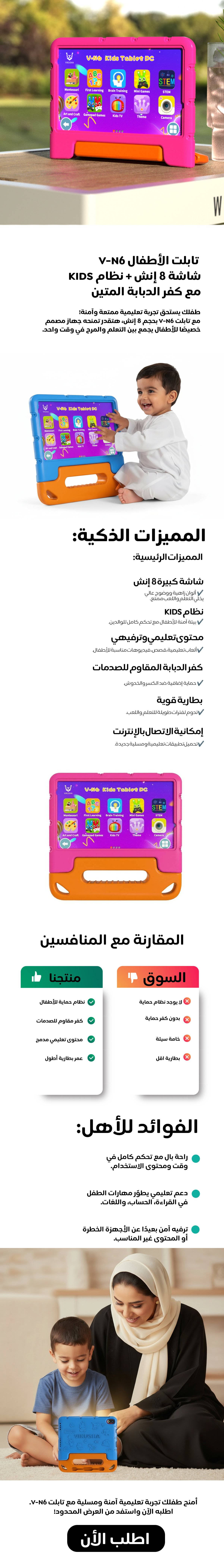 تابلت للأطفال 8 انش v-n6 يدعم نظام ال kids + كفر الدبابة