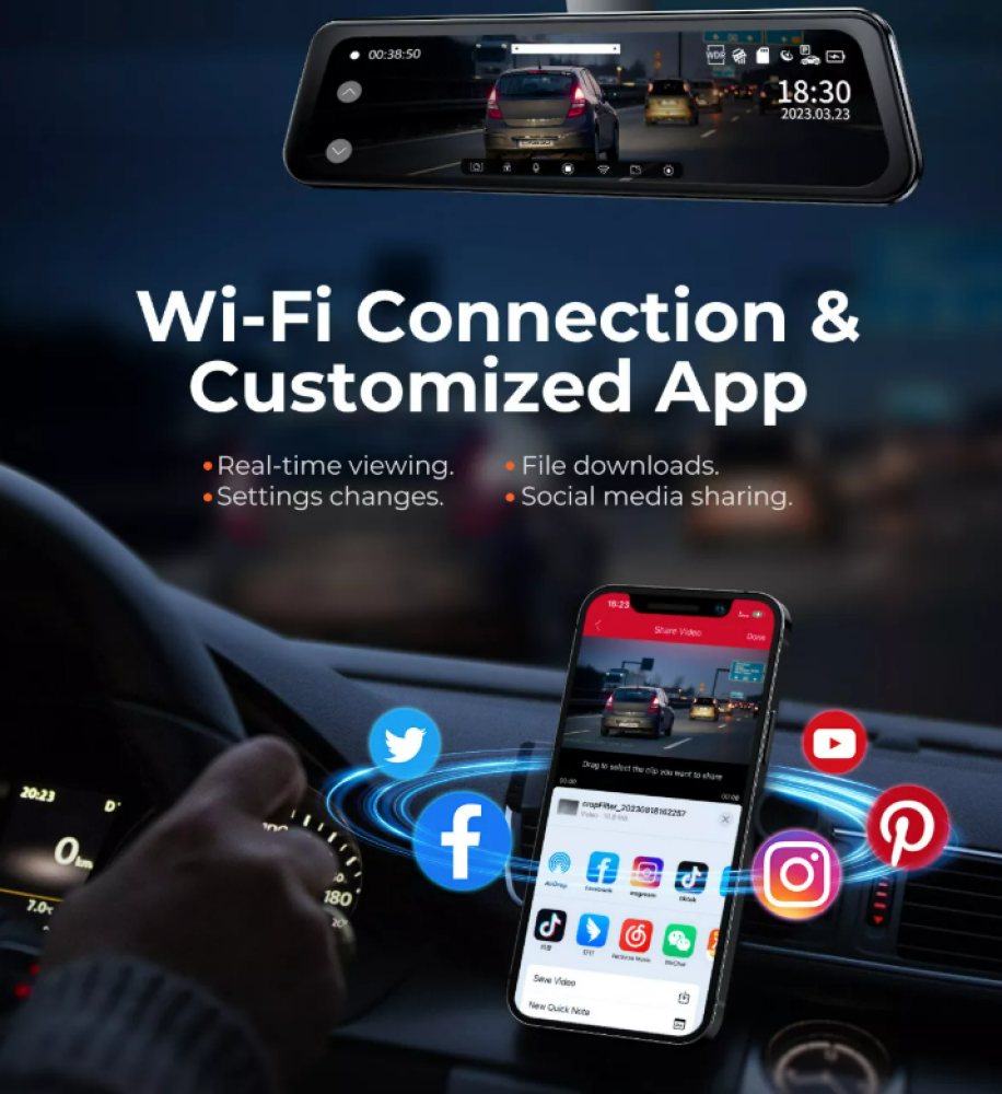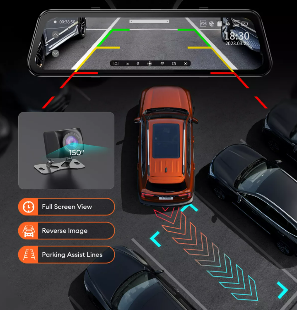 وتدعم الكاميرا أيضًا ميزات G-Sensor، Loop Recording، Parking Monitor، Reverse Assist، وVertical Flip لجعل القيادة أكثر أمانًا وراحة.