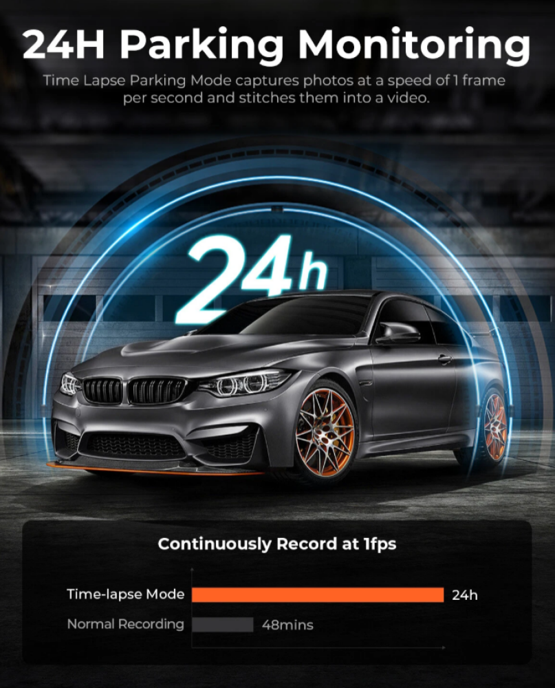 - 🅿️ مراقبة أثناء الوقوف (Parking Monitor) لتسجيل أي حركة أثناء توقف السيارة.