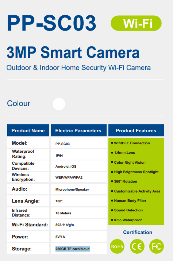 Phone Planet – كاميرا مراقبة ذكية Wi-Fi إصدار SCO3 بدقة 3 ميجابكسل، مقاومة للماء IP65، تدعم الصوت ثنائي الاتجاه وبطاقة ذاكرة حتى 256 جيجابايت