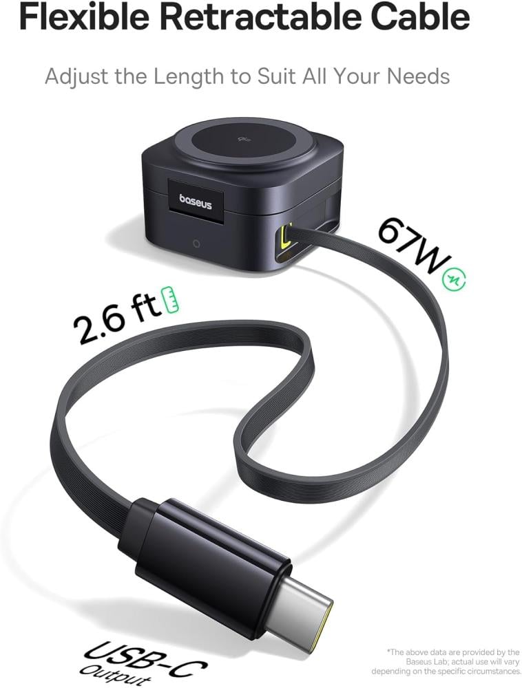 - 67W Retractable Cable: Supports fast charging for tablets and smartphones without the need for messy wires.